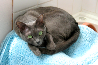 Korats are a slate blue-grey short-haired breed of domestic cat with a small to medium build and a low percentage of body fat. Their bodies are semi-cobby, and surprisingly heavy for their size. They are intelligent, playful, active cats and form strong bonds with people. Among Korats' distinguishing characteristics are their heart-shaped heads and large green eyes. They are one of a few breeds where individuals have only one color.